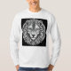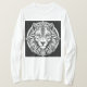 Ilustración altamente detallada y estilizada de la cara de un león. El león se representa en blanco y negro, mostrando un intrincado trabajo de línea que enfatiza su melena y rasgos faciales. Los ojos del león son penetrantes y llenos de expresión, llamando la atención. Alrededor de la cabeza del león hay un diseño circular decorativo que complementa la figura, añadiendo un elemento de simetría y profundidad. El fondo negro contrastante resalta la detallada maestría artística y le da a la composición general una apariencia llamativa y majestuosa.