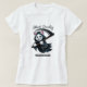 Un diseño simple y lindo de un gato vestido como Parca Grim Reaper, con una pequeña guadaña. El gato tiene una expresión adorable pero maliciosa, con un pequeño manto encapuchado. El texto "Silencio pero Mortífero" está escrito a continuación en una fuente lúdica, agregando humor al diseño.