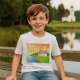 Lleve al aire libre la ropa de uso diario con esta camiseta para niños que presenta una casa de campo junto al ilustracion del lago. El diseño muestra una casa rústica, agua tranquila y un fondo de puesta de sol, lo que le da a esta camisa un aspecto colorido y divertido. Cómodo y versátil, es ideal para las salidas escolares, de juegos o de fin de semana. Un regalo perfecto para los niños que disfrutan de la naturaleza, paisajes y obras de arte creativas.
