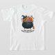Cauldron Of Giggles And Gummies T-Shirt. A cheerful cauldron beams, stuffed with candies exploding like confetti, proudly sporting a witch hat. Its broomstick buddy leans close, clearly waiting for sweet-fueled liftoff, Halloween’s happiest sugar-powered witch-mobile!