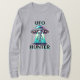 Gráfica Alien y OVNI para aquellos en UFOlogy. Un extraño lindo que está siendo borrado de un OVNI. El texto dice: "Cazador de OVNI" en camisa negra y turquesa para mujeres.
