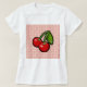 Cerezas rojas brillantes sobre el fondo de un patrón de flores rosadas de estilo retro