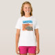 Una divertida y colorida pluma acuática y un dibujo en tinta de una tortuga marina en la playa (¡y no te pierdas el cachorro en el surf!) adornan la parte delantera de esta camiseta de chica.