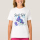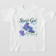 ¡Nuestras camisetas del diseño del chica del patinador, las tazas, los bolsos, las tarjetas, las almohadas, los relojes de pared, los recuerdos, las sudaderas con capucha, y otros artículos patinadores del tema ofrecen un par de patines del azul y de la lavanda y las manoplas en una secuencia rodeada por las porciones de copos de nieve y de texto hivernales que lea al chica del patinador!
