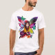Un hadas joven con las vibrantes alas multicolores se arrodilla con gracia, rodeado de mariposas flameantes. Está adornada con un traje colorido con flores que le acentúan el pelo y tiene una delicada flor en la mano