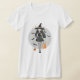 Un lindo ilustracion de una pequeña bruja vestida de negro con pechos a rayas, sosteniendo una escoba y una bolsa llena de dulces. Rodeado de murciélagos, estrellas y dulces, este juguetón diseño de Halloween le da un toque divertido y festivo a cualquier producto.