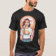 Este diseño de estilo vintage cuenta con un elegante chica que sostiene un cono de helado. Con su cabello ondulado y su maquillaje clásico, desprende un encanto retro. Lleva una camiseta blanca adornada con un gráfico sereno para la puesta de sol, que complementa perfectamente el cálido fondo de atardecer pastel. La estética general combina elementos nostálgicos con un toque moderno, que capta una atmósfera veraniega intemporal.