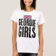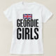 Esta camisa muestra Union Jack (bandera de unión) en rojo patriótico, blanco y azul, debajo es las palabras "CHICA de GEORDIE" escrito en letras intrépidas negras.