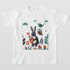 The image is a colorful flat style illustration showing a black and white rabbit holding a flowerpot with a red flower. In addition, there are illustrations of a green bird, a brown owl, small houses, clouds and plants. The illustration also includes elements of dots and small flowers scattered in the background.