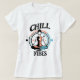 Mujer meditando gráfico con texto, "Chill Vibes" sensación relajante e iluminada.