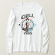 Mujer meditando gráfico con texto, "Chill Vibes" sensación relajante e iluminada.