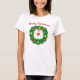 T-shirt with my digital design of a pretty Christmas wreath decorated with blue, green, red, white and purple hearts and a big red heart hanging from a red ribbon. Red text says "Merry Christmas".
