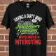Añade un toque de humor a tu armario con esta ingeniosa y descarada camiseta con la cita audaz: "Tener una mente sucia hace que las conversaciones ordinarias sean mucho más interesantes". Perfecto para todo aquel que tenga una personalidad lúdica y un gran sentido del humor, este diseño es un comienzo de conversación garantizado. Ideal como regalo para amigos, compañeros o cualquier persona a la que le gusten los dichos graciosos y sarcásticos. Ideal para fiestas, salidas informales o simplemente mostrar tu lado divertido todos los días. Hecho para el confort y el estilo — este tee es imprescindible para los que aman mantener las cosas interesantes!