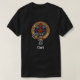 Insignia escudo Clan Clark rodeada por una correa y hebilla sobre el fondo del tartán. Texto personalizado.