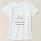 El diseño muestra una camiseta de mujer minimalista elegante en negro y blanco. Un hermoso texto "mrs" único en caligrafía caprichosa en la parte superior y un apellido y fecha personalizables en la parte inferior. El diseño es extremadamente único y clásico y será un artículo elegante para regalar a cualquier novia o recién casada como regalo.