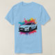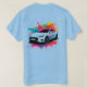 Un auto eléctrico moderno ilustrado digitalmente contra un vibrante salpicón de pintura multicolor, que combina innovación y arte.
