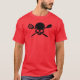 Cráneo y espátula y cuchara de la cruz. Cocinar la camisa de la referencia. Cráneo negro sobre la cuchara y la espátula de madera cruzadas.