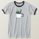El color es muy bonito al natural, como la foto. El tejido es suave y de buena calidad. Sin defectos en el tintado, ni hilos sueltos o descosidos. Bien la impresión. Los bordes de las letras y el dibujo son nítidos, y el color contrasta muy bien con el de la camiseta.