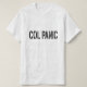 Un pánico en el núcleo ocurre cuando un sistema operativo detecta un error fatal interno del que no puede recuperarse de forma segura. El término se usa para sistemas unix y unix a diferencia de la infame BSoD (Pantalla azul de la muerte) en el sistema Windows. Esta divertida camiseta blanca tiene el texto "COL PANIC" impreso en una letra negra. Un juego de palabras sobre el "pánico del núcleo" como COL es la abreviatura de Colonel, que se pronuncia como kernel.