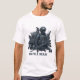 Ultra-realistic dynamic combat loadout T-shirt featuring generic tactical gear and weapons (generic shapes only), muted dark blue and gray armor with metallic details, subtle smoky battlefield hints. Optional text: "Battle Ready" or "Victory Awaits".