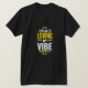 Un diseño de citas motivacional y positivo con la frase "Totalmente Amando mi Vibe" en letras audaces y estilizadas. El texto está rodeado de elementos decorativos, incluyendo estrellas y líneas, creando una composición dinámica y energética. La paleta de colores es clara y alegre, el amarillo y el blanco contrastan con el negro.