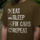 Diversos dichos para mecánicos, artesanos y amantes de los autos "Eat Sleep Fix Cars Repeat". Para los gearheads y la mecánica, este diseño es un gran ejemplo para mostrar su experiencia y la forma perfecta para celebrar su combinación única de habilidades y conocimientos sobre los coches.