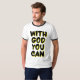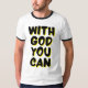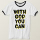 Este diseño de camisetas de jengibre tiene las palabras "Con Dios que puedas" en un estilo de burbuja impreso más letras negras y contorno de sombra amarilla con un estilo de tipografía en este tema basado en la fe. Este tee tiene un aspecto de inspiración vintage con esposas contrastantes y un escote para un ambiente deportivo pero informal.