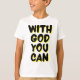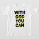 El diseño de esta camiseta masculina tiene las palabras "Con Dios que puedas" en un estilo de burbuja impreso más letras negras y contorno de sombra amarilla con un estilo de tipografía en este tema basado en la fe. Este tee es cómodo, casual y suelto, hecho de algodón al 100%, con el fondo cosido de doble aguja y las mangas para mayor durabilidad nuestros tés encajan y llevan bien en todos y cada uno.