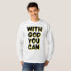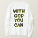 Este diseño de manga larga tiene las palabras "Con Dios que puedes" en un estilo de burbuja impreso más letras negras y contorno de sombra amarilla con un estilo de tipografía en este tema basado en la fe. Esta camiseta de manga larga es cómoda, casual y suelta, hecha de algodón 100% pre-reducido, con el fondo de la aguja doble y las mangas para mayor durabilidad, tiene una imagen más pequeña de casamiento en la parte posterior que nuestros tees encajan y lleva bien en todos y cada uno.