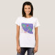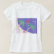 Esta camiseta está diseñada con una colorida escena insular que incluye palmeras, un océano azul y un velero.