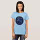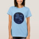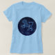 Tee que presenta el símbolo zodiaco para Leo en azul plateado suave, como un medallón redondo, dominado por las estrellas de la constelación, contra un fondo cielo estrellado clasificado de azul oscuro a negro.