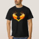 Ángel dispara el corazón con las alas flameantes sobre fondo negro.