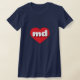 Esta camiseta tiene un vibrante corazón rojo que contiene las letras negrita, blanca, redondeadas de funda inferior md, una abreviatura juguetona para el estado de Maryland, la vieja línea de estado.