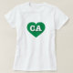 Esta camiseta presenta un vibrante corazón verde ecológico que contiene las letras audaces, blancas y altas del funda CA, la abreviatura oficial del estado de California, el estado dorado.