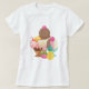 Una camiseta ilustrada con el dibujo de un helado de 3 cucharadas con rociadas de colores. Un cono de helado con cucharas de chocolate, fresa y vainilla. Un bol de helado neopolitano con una cereza encima. Fresas y una piña se sientan al lado de las cuencas. Summery y dulce.