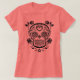 El diseño del cráneo de azúcar del Día de los Muertos está rodeado por cuatro rosas tribales. El cráneo está formado por líneas negras y está decorado con corrientes de remolinos y patrones de punto. Los ojos circulares están hechos de pedales de flores con cinco estrellas en el interior. Una sola estrella aparece en la parte inferior del diseño, anclando este patrón simétrico. Este cráneo de azúcar simple y elegante hace un diseño elegante de camisa.