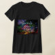 La camiseta de esta mujer es negra. Tiene un panel frontal colorido, con una carretera a la distancia (que simboliza el futuro), y una mariposa multicolor (que simboliza cómo nuestras experiencias pueden transformarnos) -junto con las palabras motivacionales- Crecer a través de lo que uno pasa.