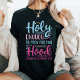 Acepta tu fe y ferocidad con esta camiseta audaz e ingeniosa. "Lo suficientemente sagrado como para rezar por ti, la capucha suficiente como para golpearte", le habla a la multifacética mujer que equilibra la espiritualidad con un toque de sass. Perfecto para la iglesia, el brunch o el uso diario, esta camisa seguro que le dará la vuelta a la cabeza y encenderá las conversaciones. Muéstrale al mundo tu fuerza, fe y sentido del humor con este singular tee.