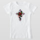 Cruz de plata con rosa roja y hojas negras sobre fondo blanco.