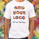 Promote your business, club or organization in style with this customizable logo and text t-shirt. These shirts can be personalized with your own unique logo and name or message, for a variety of uses. Provide to team members for a unified look in publicity photos, add to corporate 'goodie bags', offer as prizes in fundraising competitions, and distribute at promotional events. To create your own design using this template, simply click 'Personalize' to upload your logo and customize the text, and you will be able to preview the result before checkout.