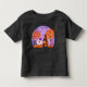 Camiseta pequeña de Halloween con un gnomo, fantasma, calabazas y árboles caídos con una luna morada en el fondo.