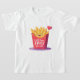 A cute and colorful cartoon illustration of a red French fries carton with a happy kawaii smiling face. The design features a floating red heart and the romantic funny pun quote "I only have FRIES for you". The image has a white sticker border, making it perfect for Valentine's Day greeting cards, fast food lovers, and humorous romantic gifts. Isolated design.