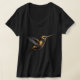 Camiseta negra de colibrí dorada. Un colibrí con oro y plata y algunas marcas negras volando de izquierda a derecha. Hermoso animal costarricense y las aves más pequeñas, pero no las más débiles.