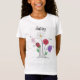 A whimsical ink drawing of a variety of flowers emphasizing the daisy. The name Daisy appears in text across the chest. A playful and innocent mood is created by colors of black, white, red, purple, yellow and green along with a lower case text. On the back is a single daisy. This tee should delight any girl with the name Daisy.
