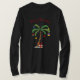 Camisas de manga larga para damas mostradas en negro con una estampada festiva de palmera con texto Feliz Navidad. Ideal para las vacaciones. Personalizar este artículo o compra tal cual.