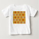 Esta camiseta de bebé tiene un diseño art deco de formas diamantíferas hechas de ángulos superpuestos en líneas negras coloreadas en tonos naranja y amarillo con líneas negras diagonales que hacen que el diseño parezca estilo de argyle