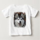 El perro de trineo del husky siberiano para arriba cierra la camiseta del bebé.