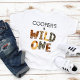 Cute y simple camiseta de safari para niños con tema de cumpleaños número uno con la palabra wild one escrita en varias impresiones de piel de animales de la jungla.