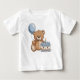 Un dibujo caprichoso de estilo cómico de un oso de peluche agarrando un globo, sentado frente a una tarta de cumpleaños adorable coronada con una sola vela.