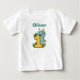 This personalized baby t-shirt features a cheerful, baby blue T-Rex wearing a party hat and embracing a large, bright yellow number "1", accented with tropical jungle leaves.